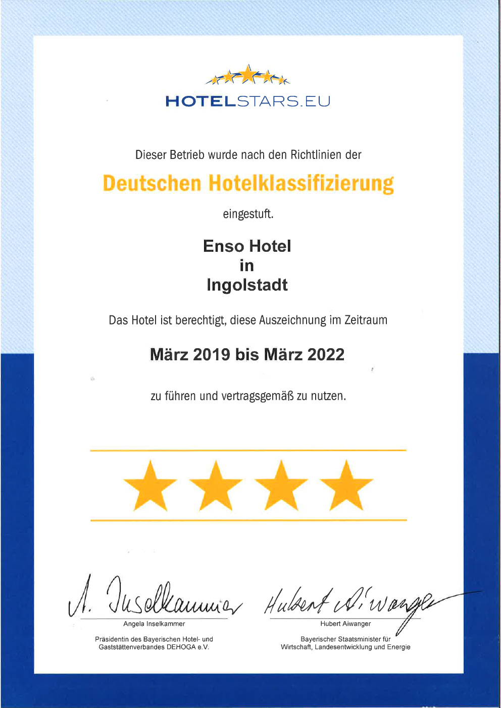 Bayerischen Hotel und Gaststättenverbandes DEHOGA Bayern, Angela Inselkammer, haben heute in München die 4 Sterne Klassifizierungen an das enso Hotel Ingolstadt verliehen.