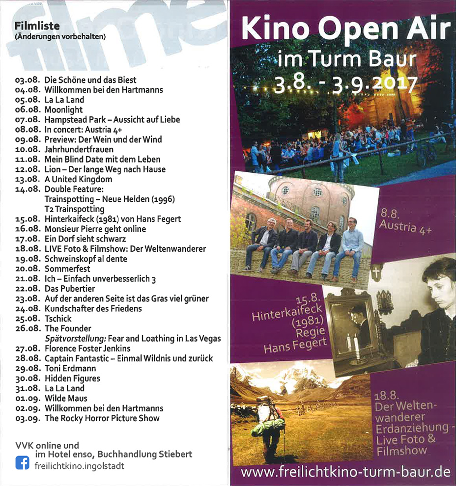 Ab dem 3.8. bis 3.9.2017 beginnt wieder in Ingolstadt die KINO OPENAIR Zeit im Turm Baur. Karten erhalten Sie auch im enso Hotel an der Rezeption!